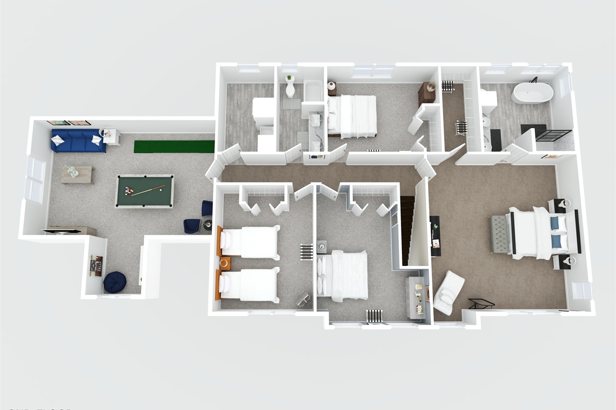Two additional upstairs bedrooms each offer a queen-size bed and easy access to a full shared bathroom, providing comfort and convenience for couples or solo guests.