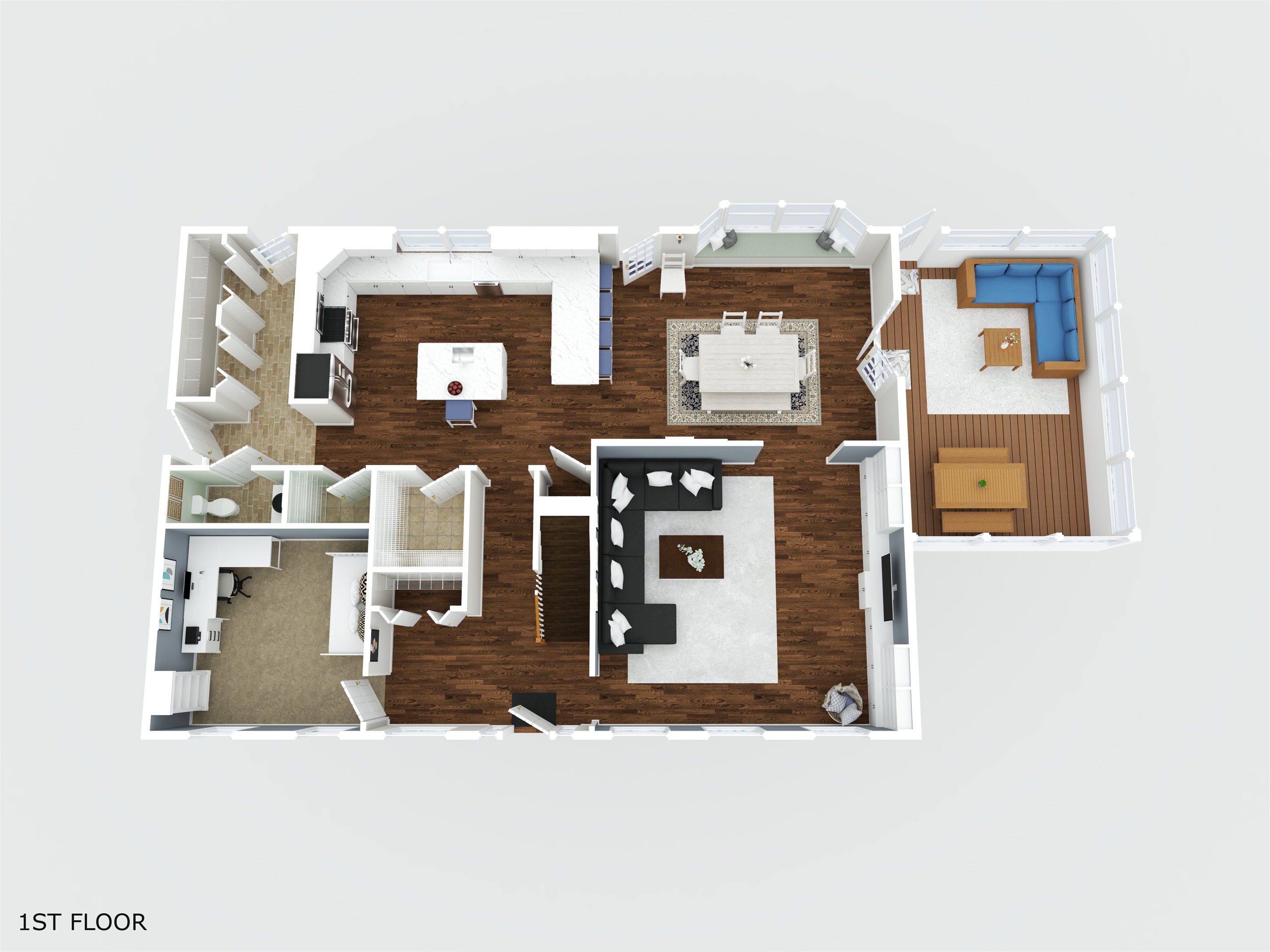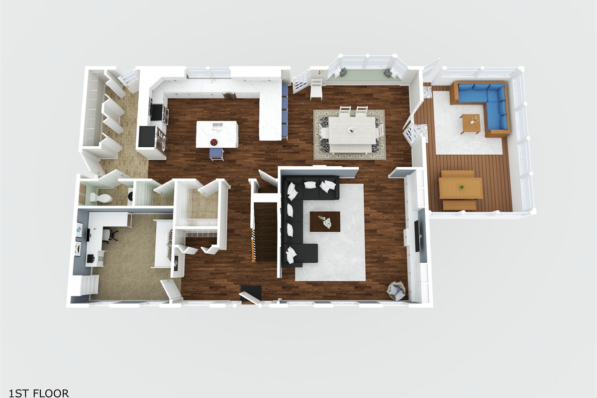 The kitchen connects seamlessly to the main living areas and is complemented by a SONOS speaker system, allowing you to play music throughout the space via WiFi. Central air conditioning keeps the home comfortable year-round.