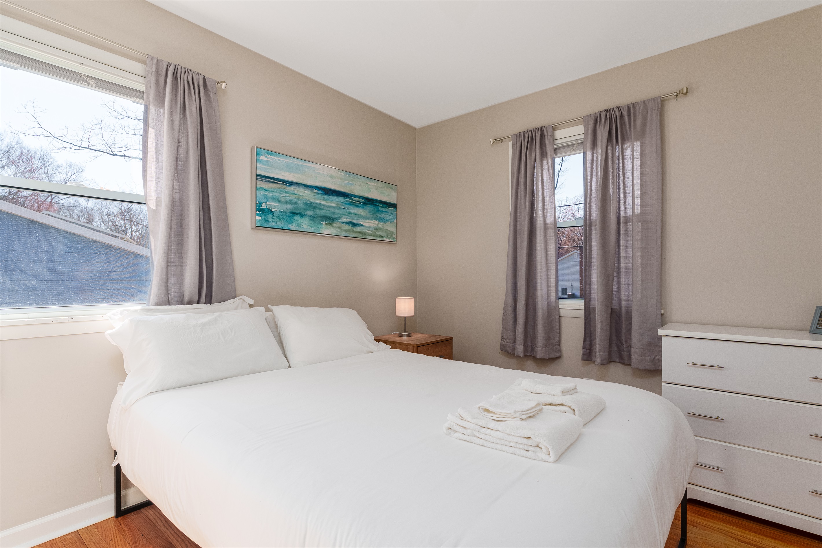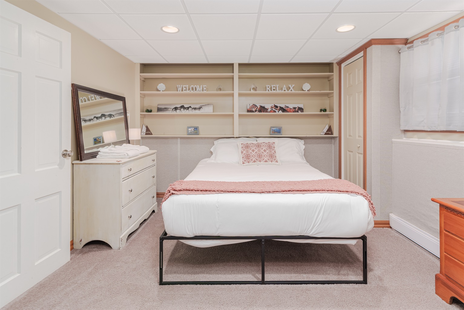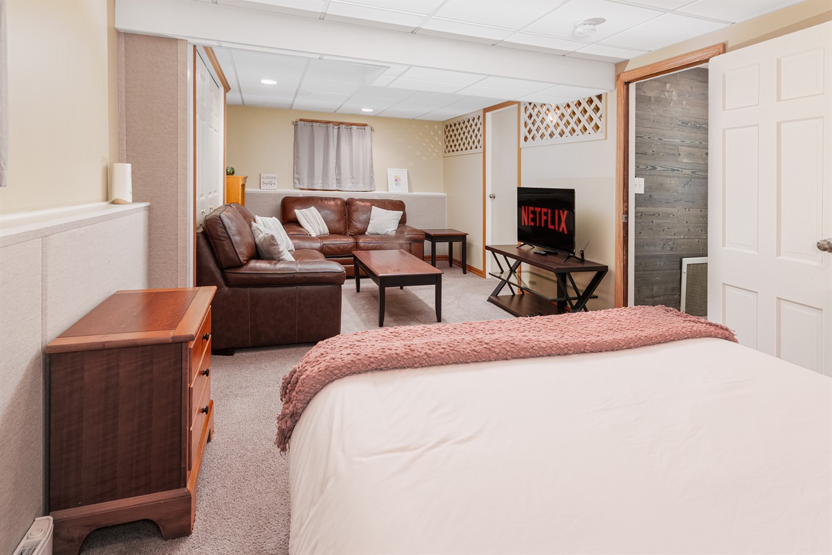 Each bedroom has a plush bed and dresser. The large basement has comfy seating and a desk for your work or study. A washer and dryer are also in the basement for your extended stays. Making a presentation and need to look your best...we have an iron and ironing board so you can look sharp.