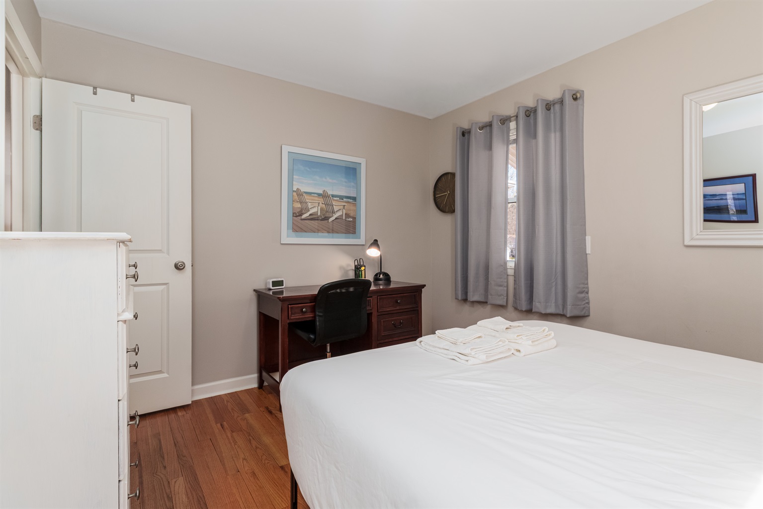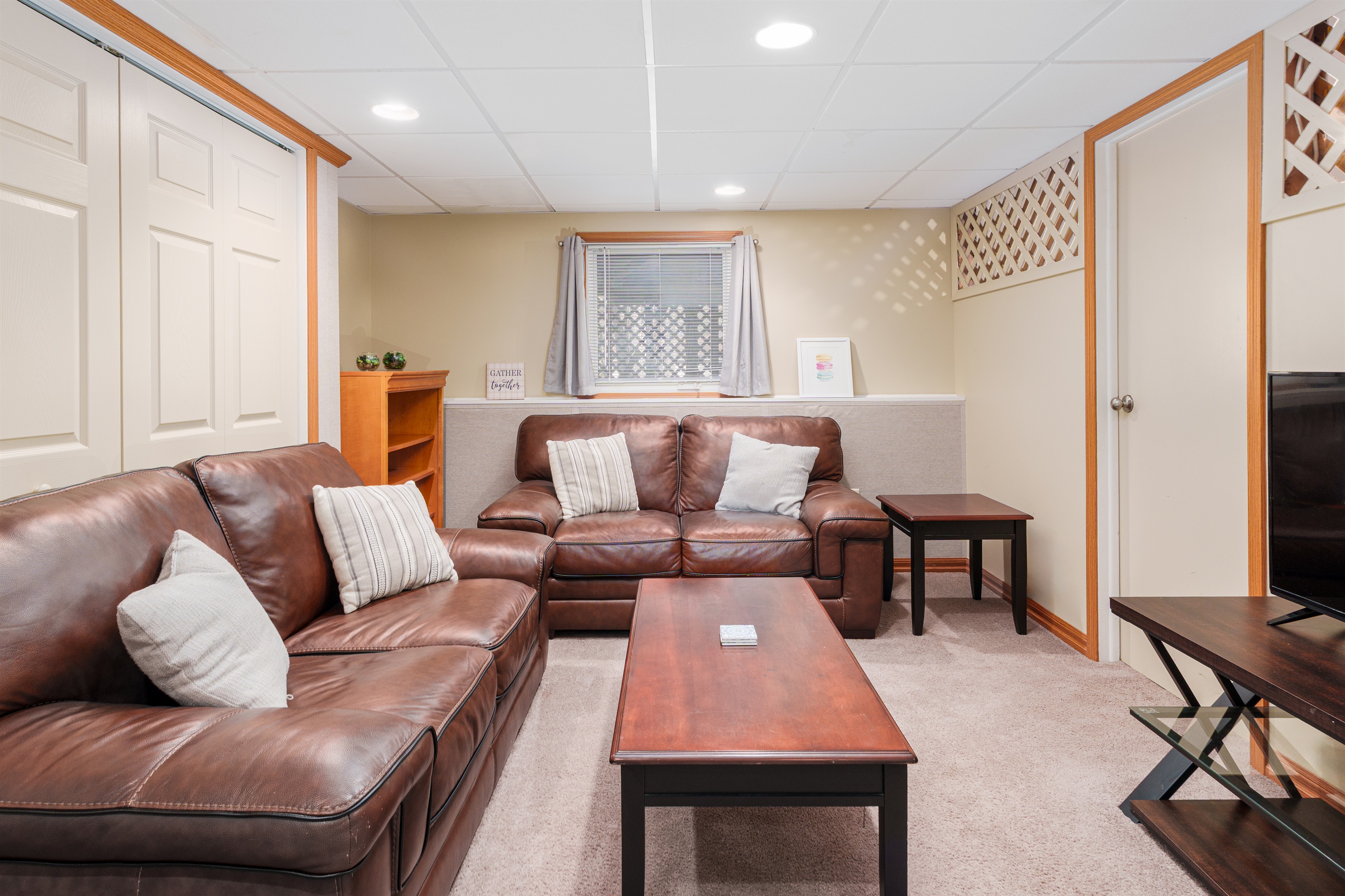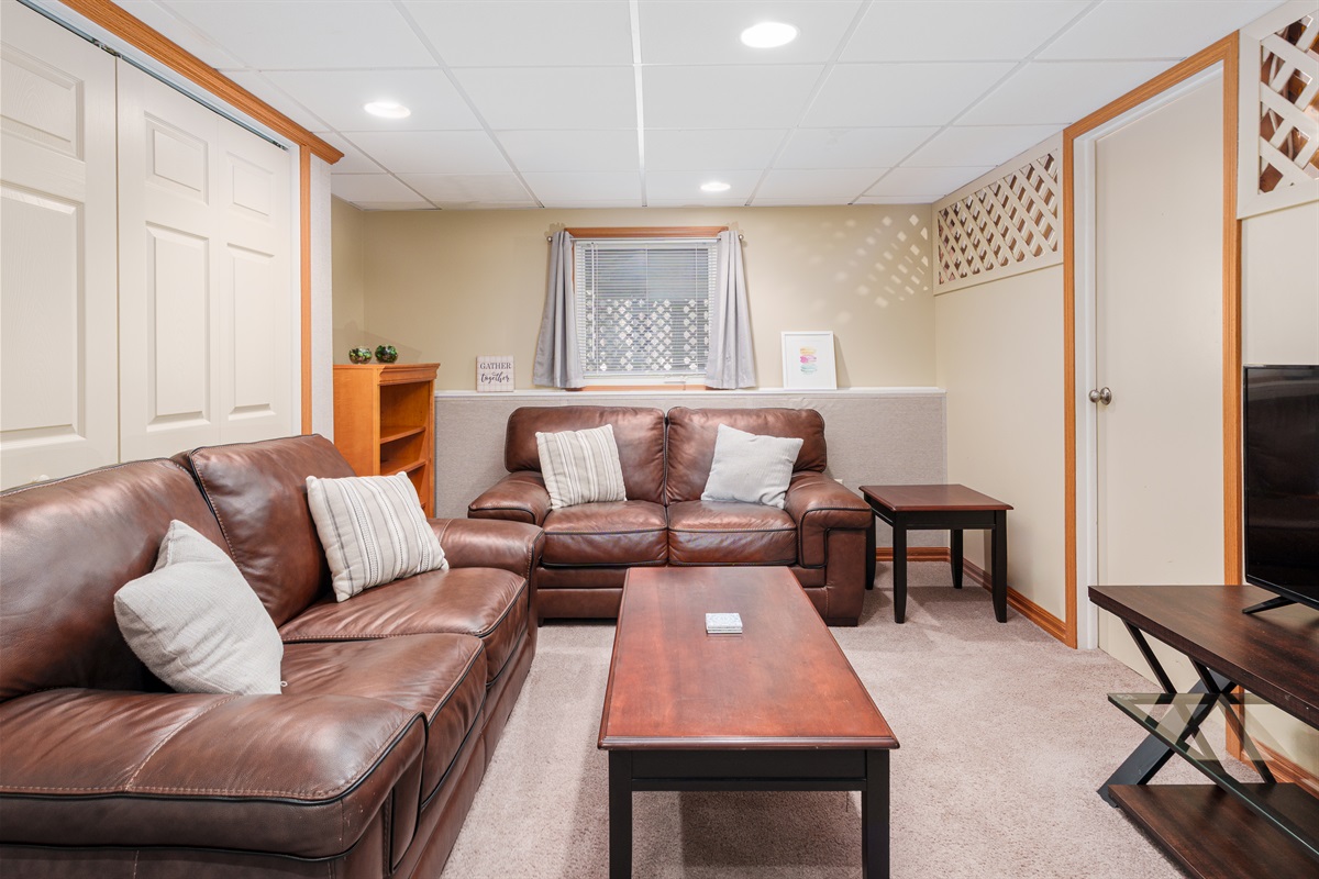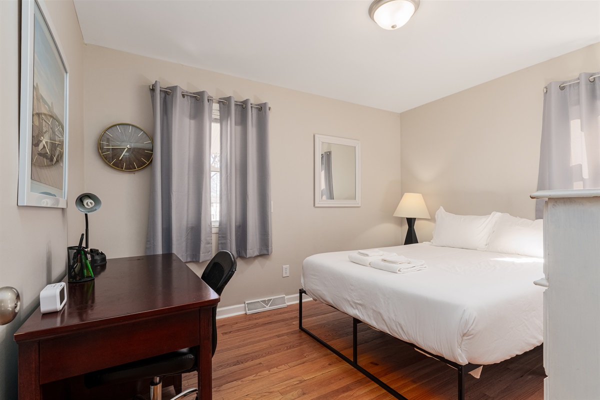 Each bedroom has a plush bed and dresser. The large basement has comfy seating and a desk for your work or study. A washer and dryer are also in the basement for your extended stays. Making a presentation and need to look your best...we have an iron and ironing board so you can look sharp.